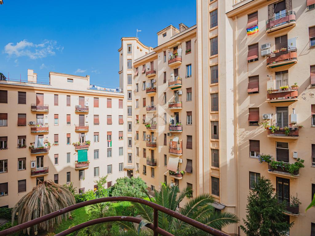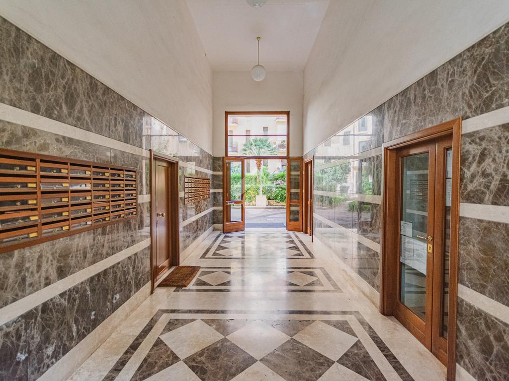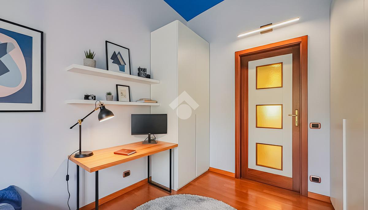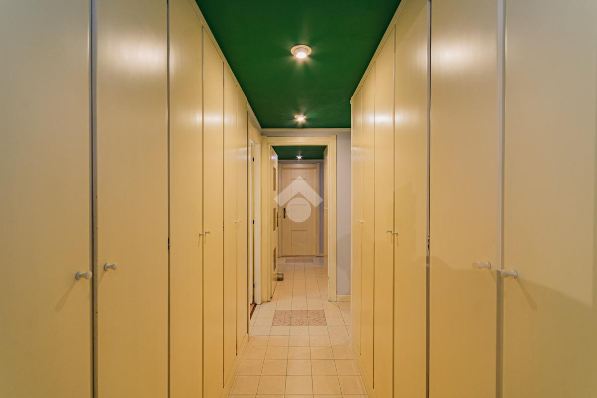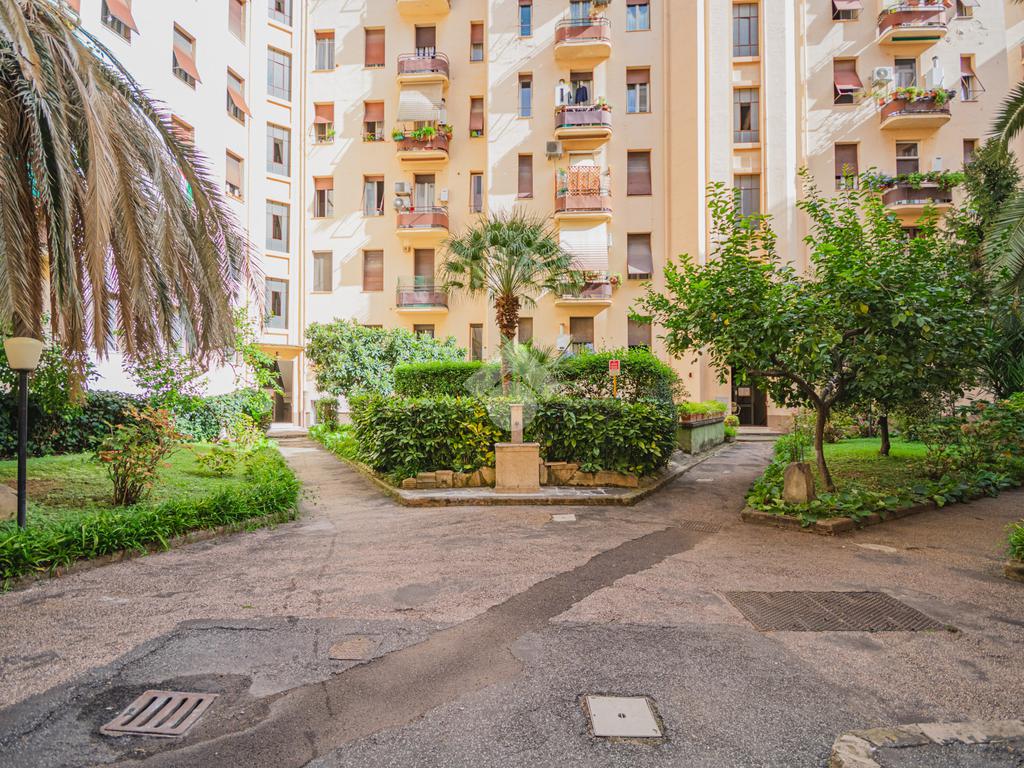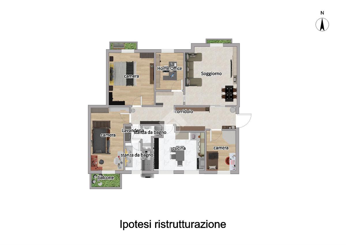 L'appartamento si compone di ingresso, tre camere da letto, ampio soggiorno, cucina abitabile, studio e due bagni. Un comodo soppalco corre su tutta la zona giorno offrendo un ulteriore spazio di deposito. La presenza di tre balconi, di cui uno con affaccio sul cortile interno del palazzo, permette di godere di spazi esterni privati, ideali per momenti di relax.