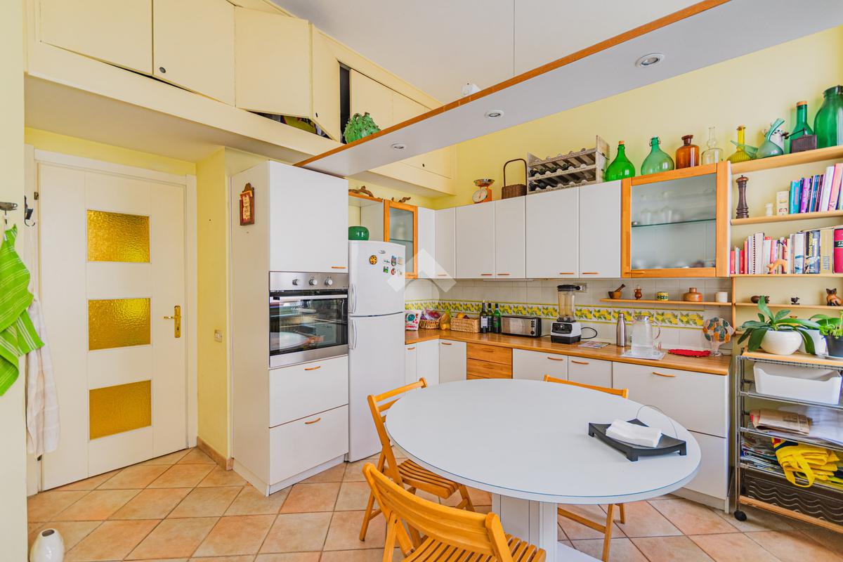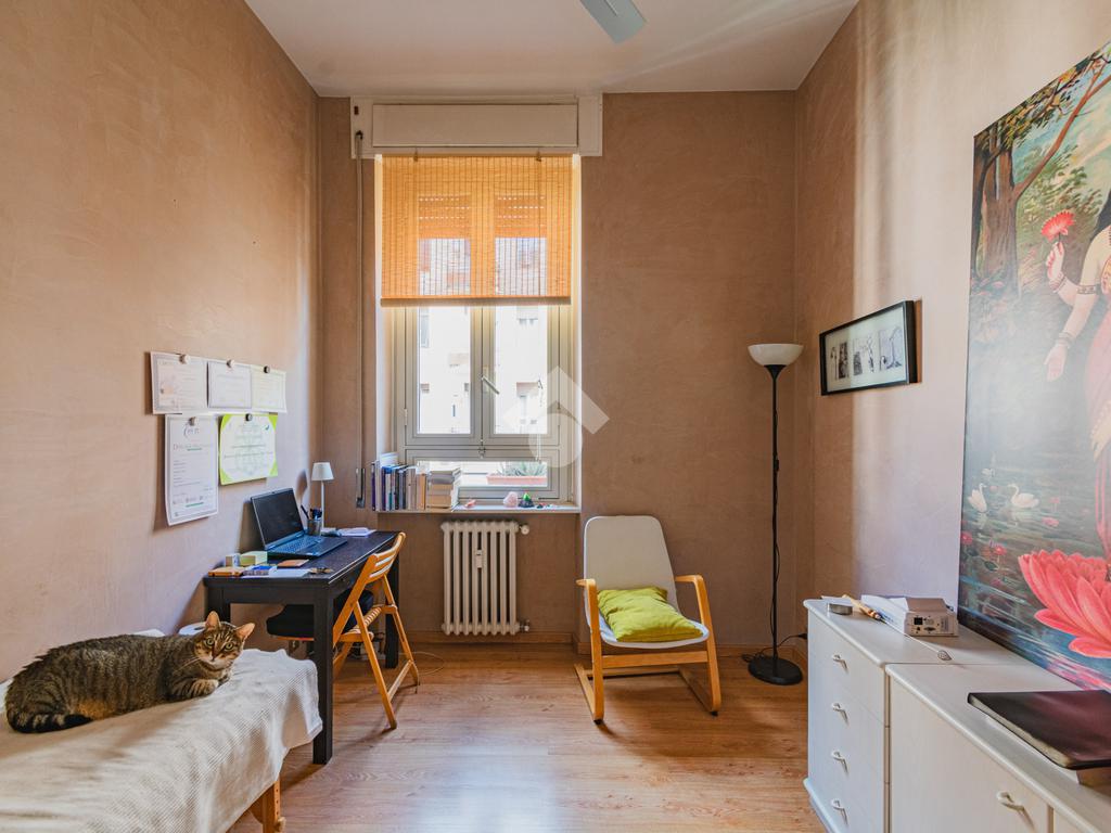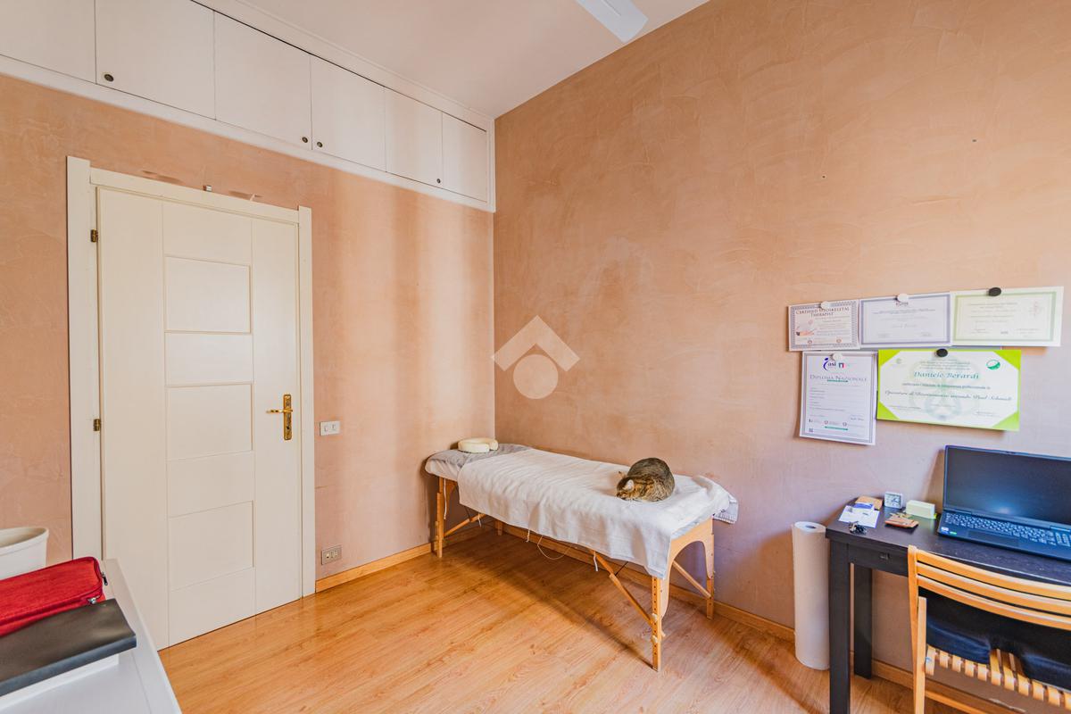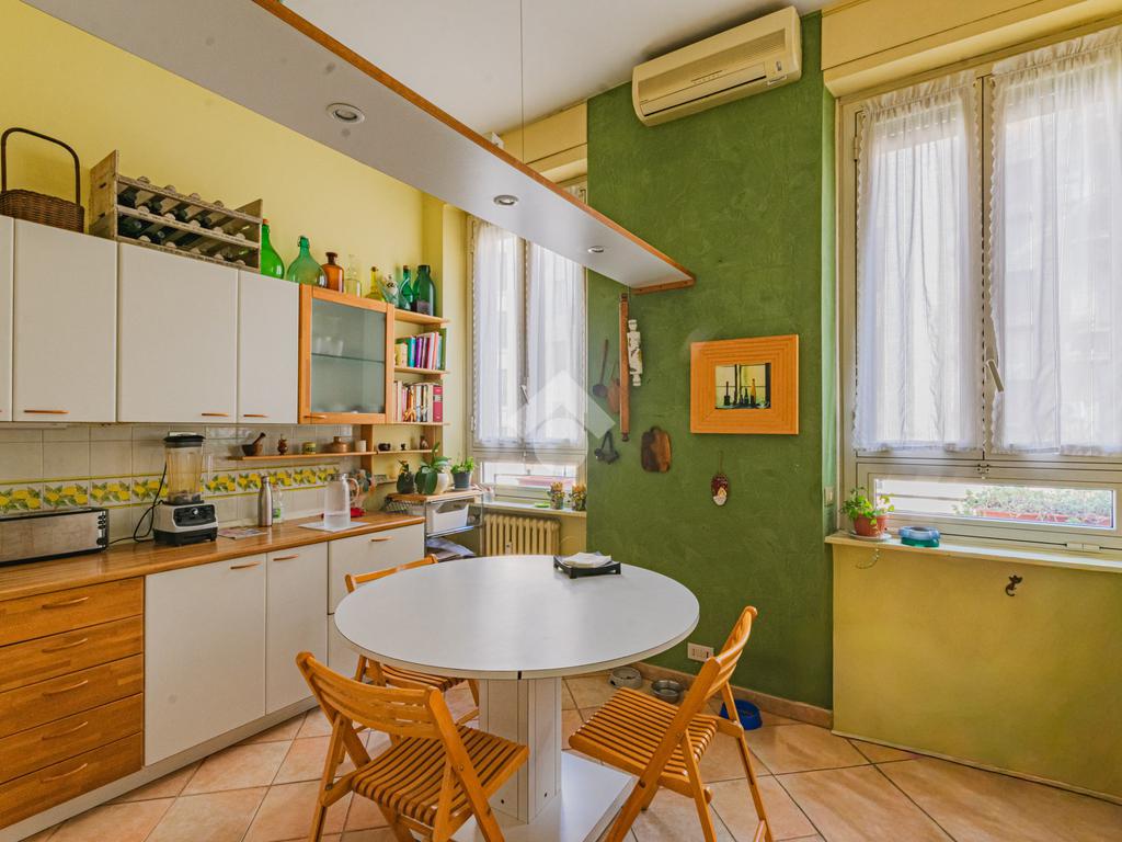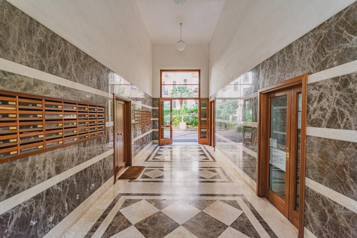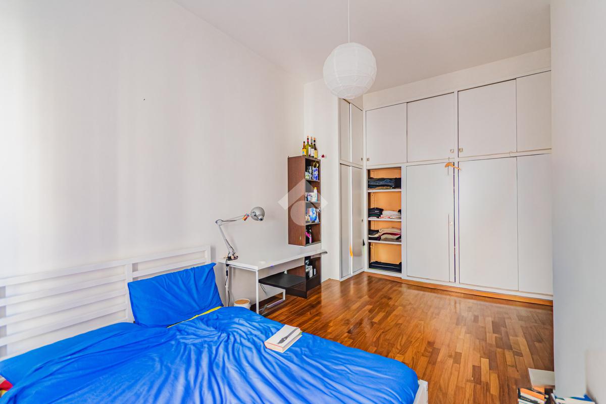 L'appartamento si compone di ingresso, tre camere da letto, ampio soggiorno, cucina abitabile, studio e due bagni. Un comodo soppalco corre su tutta la zona giorno offrendo un ulteriore spazio di deposito. La presenza di tre balconi, di cui uno con affaccio sul cortile interno del palazzo, permette di godere di spazi esterni privati, ideali per momenti di relax.