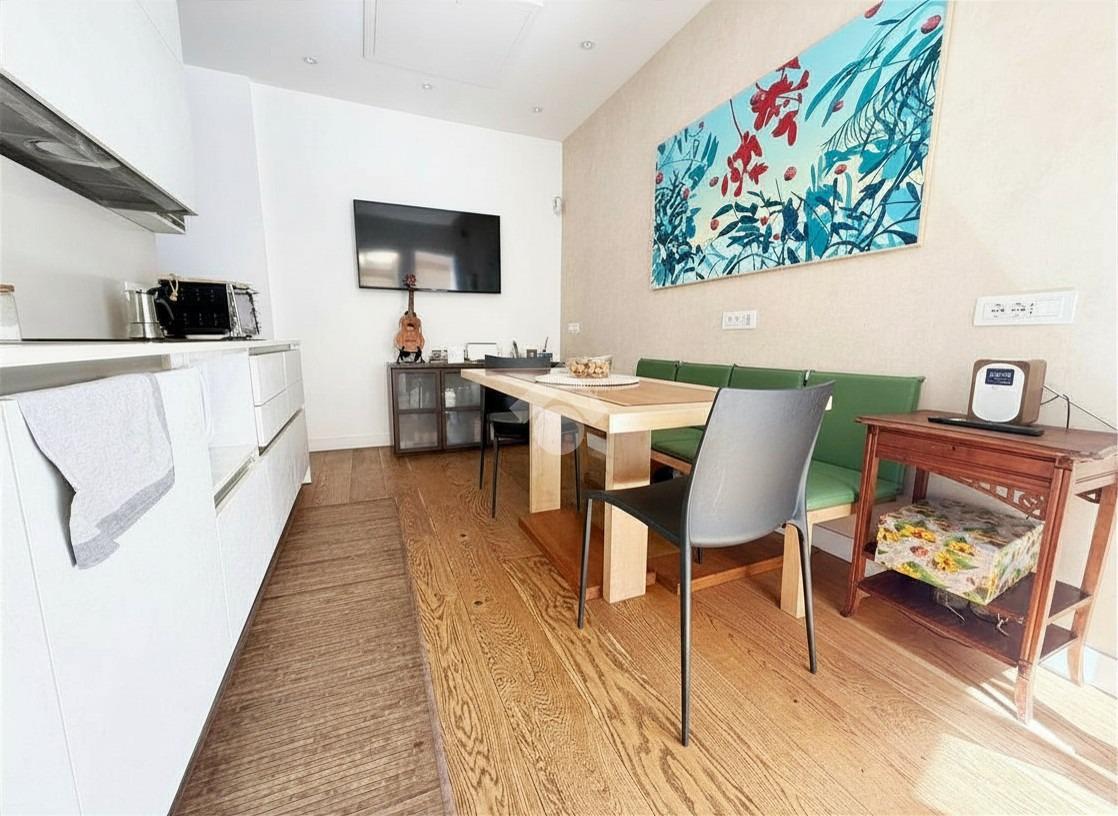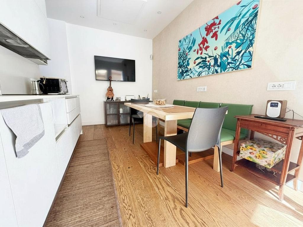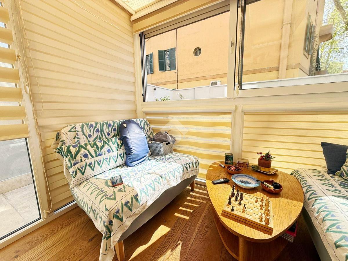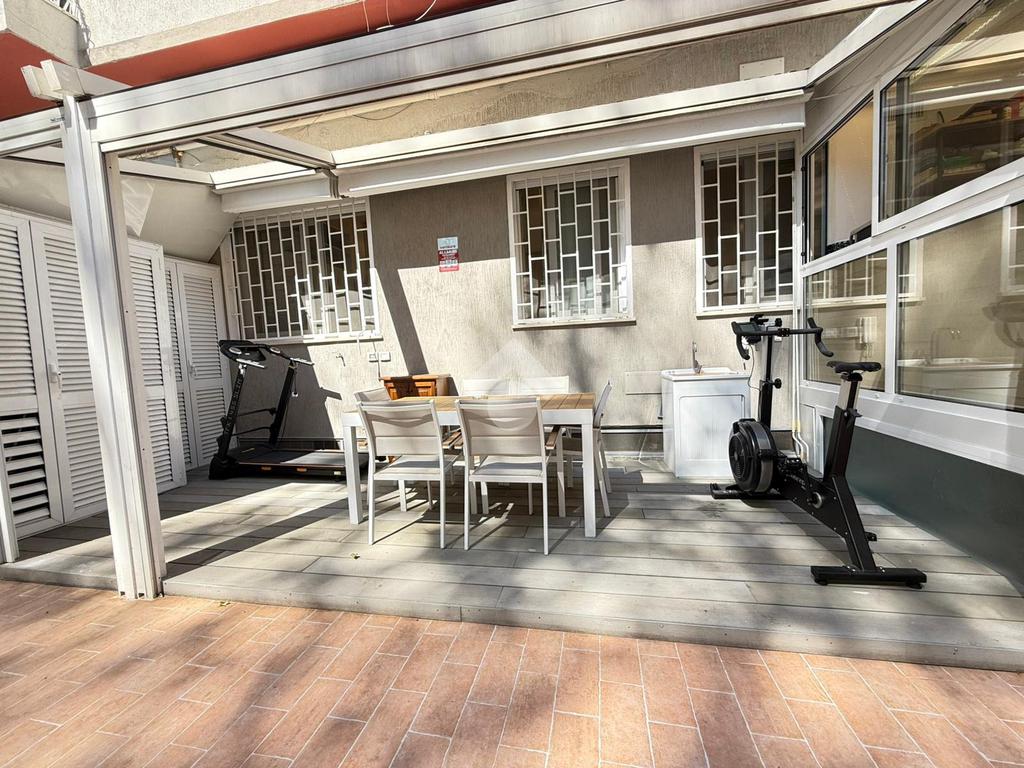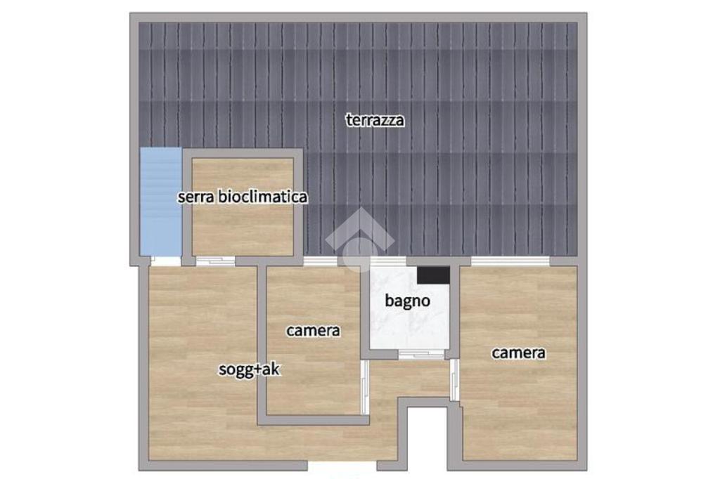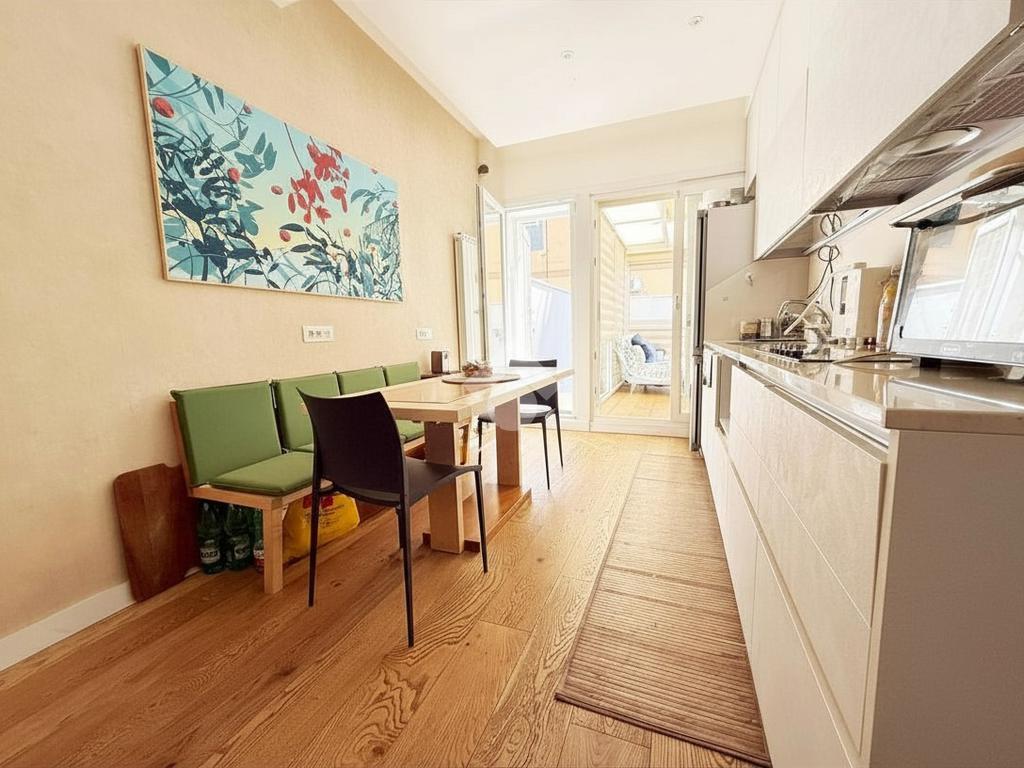 L'appartamento si compone di ingresso, soggiorno con angolo cottura, due camere da letto, bagno, serra bioclimatica e terrazzo di 45 mq parzialmente coperto da pergotenda automatizzata con pannelli ad alta rifrazione. Nella zona giorno è inoltre presente un comodo soppalco.